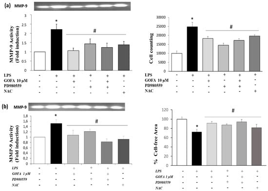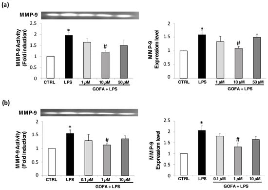 Previous studies have evidenced that MMPs, particularly MMP-2 and -9, play important roles in cancer metastasis, contributing to angiogenesis, intravasation of tumor cells, and cell migration and invasion []. To investigate whether GOFA modulates MMP-9 expression and activity, we performed qRT-PCR and zymography analysis following GOFA treatment on U937 and HCT116 cells, after inducing with LPS (Figure 6). The levels of MMP-9 were not modified by GOFA treatment alone (data not shown). The MMP-9 activity increased by 34% and 35.78% after 24 h, respectively, in U937 and HCT116 cells (* p < 0.05 for both) after LPS-stimulation compared to control cells (Figure 6). In contrast, MMP-9 activity was significantly decreased by 30.95% in U937 cells pre-treated with 10 µM of GOFA and by 27.36% in HCT 116 following the pre-treatment with 1 µM of GOFA, when compared to LPS-treated cells (# p < 0.05 for both). MMP-9 expression data performed by qRT-PCR showed a similar trend of activity. In summary, our data indicate that GOFA-attenuated invasion of LPS-stimulated U937 and HCT116 cells was mediated through the downregulation of MMP-9 at the transcriptional level.