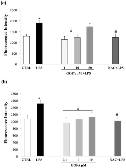 Effects of GOFA on preventing LPS-induced reactive oxygen species (ROS) production in U937 (a) and HCT116 (b) cells. Antioxidant activity of GOFA against oxidative stress LPS-induced, measured by DCFH-DA assay and compared to ROS scavenger, N-acetyl-L-cysteine (NAC). Results (n = 3) are reported as means ± SD. * p < 0.05 vs. control cells; # p < 0.05 vs. cell treated with LPS alone.