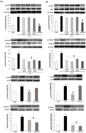 Effects of GOFA on p-p38 and pERK1/2 kinase. Analysis of phosphorylation level of p38 and extracellular signal-regulated kinases (ERK) in GOFA-treated U937 (a) and HCT116 (b) by Western blotting. Selective inhibitor of p38 (SB203580), ERK (PD980559) and ROS (N-acetyl-L-cysteine, NAC) was used as positive control. Cells were pretreated with selective inhibitors for 30 min and treated with LPS or GOFA + LPS for 24 h. The ratios of p-p38/β-actin and p-ERK/β-actin were calculated based on the relative band densities, respectively. These data are the results of a typical experiment (n = 3); * p < 0.05 vs. control cells; # p < 0.05 vs. cells treated with LPS alone.