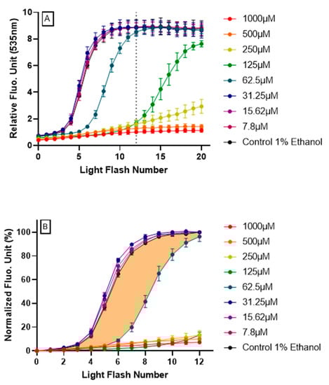 - Firstly, data obtained for the first 12 light flashes needed to reach the plateau in control conditions were normalized using the following equation: NFU% = [(RFUFNx − RFUFN0)/(RFUFN12 − RFUFN0)] × 100 with RFU = relative fluorescent unit, FNx = flash number x and NFU% = normalized fluorescence unit. Normalized profiles are depicted in Figure 2B.