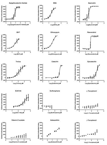 We then used CAI values to establish dose-response profiles from which efficacy concentrations 50% (EC50s) were calculated, when possible (Figure 4), after the application of a mathematical non-linear regression model (see method section for details). EC50s could be calculated for 10 antioxidants, other compounds presenting either partial or no effect, according to CAI values (Table 1). The highest AOP1 intracellular antioxidant activities (lowest EC50 values) were observed for epigallocatechin gallate, quercetin, BHA, BHT, ethoxyquin, resveratrol, Trolox, catechin, epicatechin, EUK134, in this order. We could not determine the EC50 for astaxanthin, which only showed a partial effect and for α- and γ-tocopherols, vitamin E acetate and sulforaphane, which did not show any effect. A comparison of EC50s with LogP (=LogKo/w), the octanol/water partition coefficient which indicates hydrophilic/hydrophobic status of compounds, shows that, apart from sulforaphane, antioxidants with low LogP coefficient (≤5.3) gave a measurable EC50 and that antioxidants with higher LogP values (≥10.3) showed only partial (astaxanthin) or no effect (vitamin E family). The case of sulforaphane is interesting. This membrane-permeant compound (LogP = 1.4) is known to exert its antioxidant effect through Keap1-Nfr2 pathway and not as a free radical scavenger, a mode of action that could explain the absence of effect observed using the AOP1 protocol.