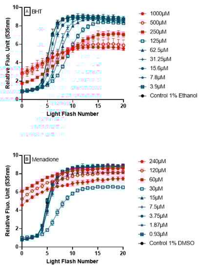 The ability of AOP1 assay to detect pro-oxidative effects from fluorescence profiles is a major attribute and added value to the approach. Figure 7 shows two examples of fluorescence profiles obtained during dose-response experiments using BHT and menadione. In both cases, pro-oxidant effects are observed following their high fluorescence values at T = 0, i.e., after the pretreatment for 4 h, but before the first light flash is applied. These profiles appear to be specific of pro-oxidant effect (see below for argumentation).