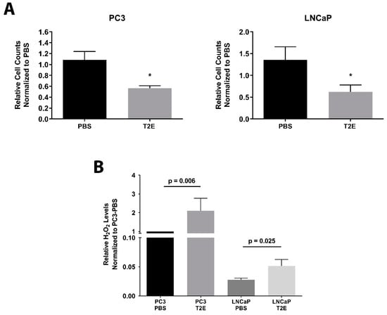 Cell growth and H2O2 levels in PC3 and LNCaP cells treated with PBS or MnTE-2-PyP treatment. (A) Both PC3 and LNCaP cells were treated with PBS or 30 µM MnTE-2-PyP (T2E), and cell numbers were calculated 96 h after treatment. (B) Intracellular H2O2 levels were measured by ROS-Glo assay. Data represent mean ± SD from at least three independent experiments. *p < 0.05 compared to PBS treatment.