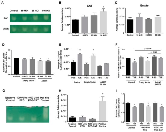 The effects of MnTE-2-PyP-induced intracellular H2O2 increase on PC3 cell proliferation. (A) A representative image of catalase activity in PC3 cells with different MOI catalase adenovirus (CAT)/empty vector (Empty) transduction. (B,C) Densitometry analysis of (A). (D) Relative PC3 cell counts with adenovirus transduction after 96 h. (E) Measurement of cellular H2O2 levels and (F) relative PC3 cell counts with 50 MOI catalase adenovirus/empty vector transduced after 96 h treatment of PBS or MnTE-2-PyP. (G) Cellular catalase activity of PC3 cells treated with PEG-catalase (1000 U/mL) or PEG (corresponding amount of 1000 U/mL PEG-catalase) for 24 h. (H) Densitometry analysis of (G). (I) Relative cell counts of PC3 cells after 96 h treatment of PBS or MnTE-2-PyP with PEG or PEG-catalase. All data represent mean ± SD from at least three independent experiments. *p < 0.05 compared to PBS treatment.