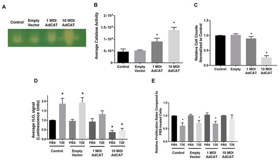 The catalase adenovirus transduction was performed as described previously []; cells were serum-starved in RPMI-1640 media supplemented with 2% fetal bovine serum for 6 h with corresponding multiplicity of infection (MOI) of Empty vector (ViraQuest Inc., North Liberty, IA, USA) or Ad5CMVCAT catalase adenovirus (produced by the University of Iowa Viral Vector Core). Cells were then recovered in full media with 10% fetal bovine serum for an additional 48 h.