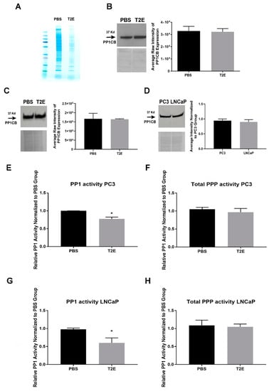 We have previously shown that MnTE-2-PyP induces protein oxidation in PC3 cells []. To identify which proteins were redox-modified in the presence of MnTE-2-PyP, we performed mass spectrometry analysis on cell lysates where proteins with reduced thiols were isolated by the BIAM probe. MnTE-2-PyP treatment led to a significant decrease in protein-BIAM binding in PC3 cells, indicating a decrease in proteins with reduced thiols (Figure 4A). Multiple bands in PBS and MnTE-2-PyP-treated samples with obvious differences were cut out of the gel and sent for mass spectrometry analysis. We found that Ser/Thr protein phosphatase 1 catalytic subunit (PP1CB) was detected in PBS-treated cells but not in MnTE-2-PyP-treated cells, indicating that PP1CB may be oxidized or its expression level was downregulated with MnTE-2-PyP treatment. PP1CB is one of the three most important catalytic subunits of PP1, and contains several thiol groups and one catalytic center that are highly sensitive to ROS. The oxidation of thiol groups or the Mn-Mn/Mn-Fe metal center can result in activity loss [,]. We measured the PP1CB protein levels in PC3 and LNCaP cells. There was no difference in PP1CB levels between PC3 and LNCaP cells (Figure 4D), and the addition of MnTE-2-PyP did not alter PP1CB expression levels (Figure 4B,C). These data suggest that PP1CB was oxidized under MnTE-2-PyP treatment.