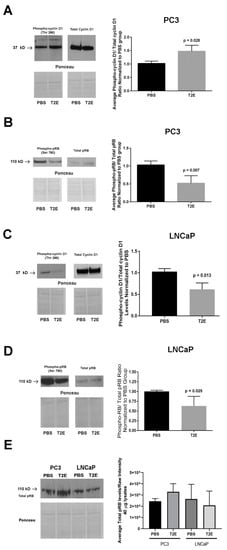 We measured several downstream targets regulated by PP1 and PP2A. MnTE-2-PyP treatment enhanced cyclin D1 phosphorylation levels by 47% in PC3 cells as compared to PBS treatment (p = 0.028, Figure 5A). Hyperphosphorylation (Thr 286) of cyclin D1 has been shown to suppress nuclear-cytosolic transportation and alter its stability [,]. pRB, which is the target of cyclin D1 and suppresses excessive cell growth by inhibiting DNA replication, was hypophosphorylated in MnTE-2-PyP-treated PC3 cells (p = 0.007, Figure 5B); however, in LNCaP cells, both cyclin D1 and pRB were hypophosphorylated, respectively (p = 0.013 and 0.025, Figure 5C,D). This indicates that PP2A or other phosphatases may directly dephosphorylate pRB in LNCaP cells. We also compared pRB levels in both cell lines, but no significant difference was observed (Figure 5E).