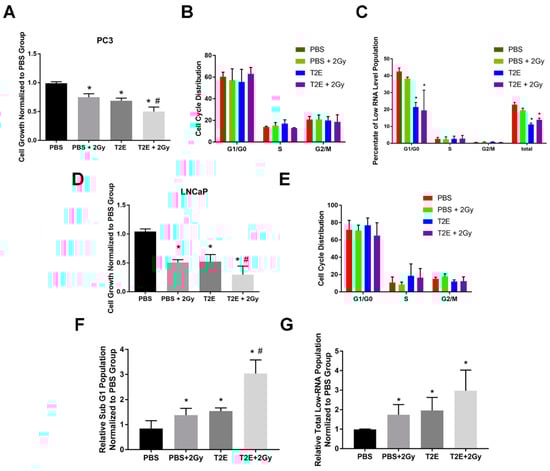 Effects of MnTE-2-PyP on cell cycle progression in combination with radiation in PC3 cells. (A) PC3 cells were seeded in media containing PBS or 30 µM MnTE-2-PyP. After 24 h, 2 Gy of radiation was applied to some groups. After another 72 h, cell numbers were determined. (B) Cell cycle analyses for PC3 cells treated with MnTE-2-PyP or radiation or the combination of the two. (C) Low-RNA population identified by pyronin and Hoechst staining. (D) LNCaP cells were seeded in media containing PBS or 30 µM MnTE-2-PyP. After 24 h, 2 Gy of radiation was applied to some groups. After another 72 h, cell numbers were determined. (E) Cell cycle analyses for LNCaP cells treated with MnTE-2-PyP or radiation or the combination of the two. (F) Measurement of sub-G1 population in LNCaP cells (G) Total low-RNA population identified in LNCaP cells by pyronin and Hoechst staining. All data represent mean ± SD from at least three independent experiments. *p < 0.05 compared to PBS treatment; #p < 0.05 compared to PBS + 2Gy treatment.