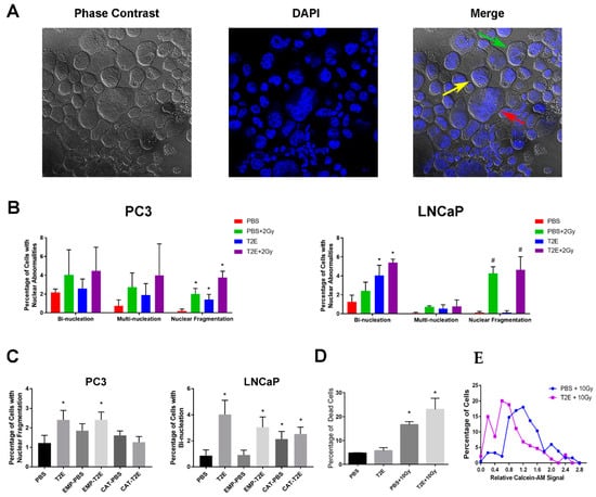 Nuclear abnormalities of prostate cancer cells treated with MnTE-2-PyP and radiation. (A) An example of bi-nucleated (green arrow), multi-nucleated (yellow arrow), and fragmented nucleus (red arrow) in PC3 cells. Cells were seeded in PBS or 30 µM MnTE-2-PyP. After 24 h, 2 or 10 Gy radiation was applied to some groups, and after 72 h, cells were fixed onto slides by cytospin. (B) Quantification of nuclear abnormalities in PC3 and LNCaP cells in each condition. (C) Quantification of nuclear abnormalities in catalase-transduced PC3 and LNCaP cells with MnTE-2-PyP + radiation treatment. (D) Calcein-AM staining for PC3 cells with MnTE-2-PyP and radiation treatment. Percentage of dead cells in each condition after 96 h treatment of PBS or 30 µM MnTE-2-PyP ± 10 Gy radiation. (E) Calcein-AM signal distribution in irradiated PC3 cells with nuclear fragmentation. All data represent mean ± SD from at least three independent experiments. *p < 0.05 compared to PBS treatment; #p < 0.05 compared to PBS + 10 Gy treatment.