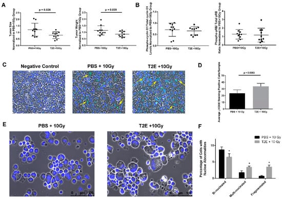 To investigate the effects of MnTE-2-PyP with radiotherapy in vivo, the PC3 tumor cells were injected orthotopically into the prostate of athymic nude mice. MnTE-2-PyP in combination with radiation (2 Gy × 5 days) significantly decreased the tumor size and weight as compared to PBS + radiation treatment (Figure 8A). We measured the phosphorylation levels of cyclin D1 and pRB in the PC3 tumor cells, but there was no significant difference between PBS + radiation and MnTE-2-PyP + radiation groups (Figure 8B). We also investigated the DNA damage and nuclear abnormalities in the PC3 tumor cells. There was a significant increase in γH2AX staining in MnTE-2-PyP + radiation treatment as compared to radiation alone (Figure 8C,D), indicating there is more DNA damage in PC3 tumor cells treated with MnTE-2-PyP. Correspondingly, both multi-nucleation and nuclear fragmentation increased, with a decrease in bi-nucleation, in MnTE-2-PyP + radiation group as compared to PBS + radiation group. These above results indicate that in an in vivo PC3 tumor model, MnTE-2-PyP + radiation treatment causes more DNA damage and nuclear abnormalities, which could be partially responsible for tumor growth arrest, rather than pRB activation.
