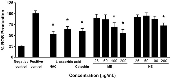 The effects of C. japonica seed coat extracts on H2O2-induced intracellular reactive oxygen species (ROS) production in peripheral blood mononuclear cells (PBMCs). Untreated cells were used as a negative control. N-acetylcysteine (NAC, 80 μM), L-ascorbic acid (250 µM), and catechin (125 µM) were used as positive controls. * Data represent the mean ± SD of three independent experiments. p < 0.05 versus positive control. ME: methanolic extract, and HE: hexane extract.