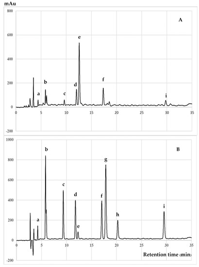 HPLC chromatograms of (A) the methanolic extract of C. japonica seed coats and (B) mixed catechin and related compounds were used as standards. The peaks are (a) gallic acid, (b) gallocatechin, (c) epigallocatechin, (d) caffeine, (e) catechin, (f) epicatechin, (g) epigallocatechin gallate, (h) gallocatechin gallate and (i) epicatechin gallate.