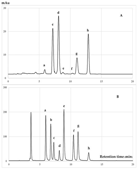 HPLC chromatograms of hexane extract of (A) hexane extract of C. japonica seed coats and (B) mixed tocotrienols and tocopherols standards. The peaks are (a): δ-tocotrienol; (b): β-tocotrienol; (c): γ-tocotrienol; (d): α-tocotrienol; (e): δ-tocopherol; (f): β-tocopherol; (g): γ-tocopherol; and (h): α-tocopherol.