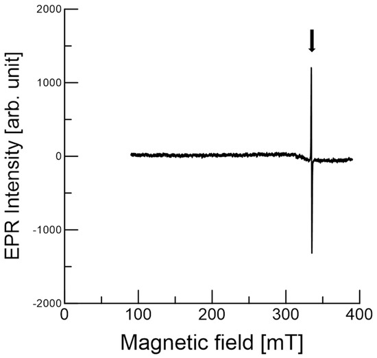 Electron paramagnetic resonance (EPR) spectra of a whole C. japonica seed at ambient temperature. The magnetic field center was 240.0 mT, with a 300 mT scan width. Each spectrum was obtained with a single scan. The arrow indicates the stable organic radicals.