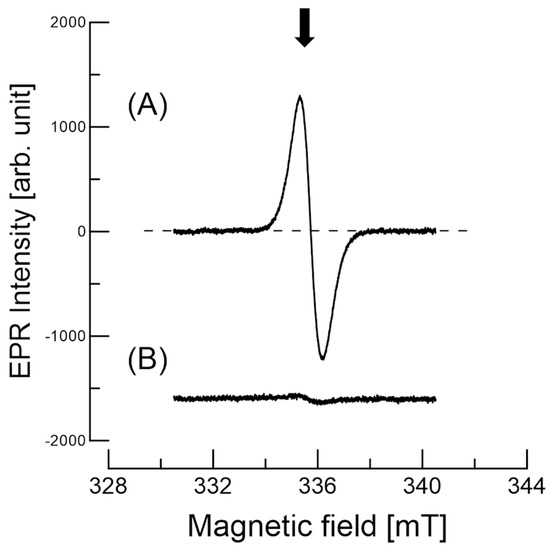 EPR spectra obtained for the g~2.002 region of (A) the C. japonica seed coats at ambient storage conditions and (B) the cotyledon of the seeds. Each spectrum was obtained with a single scan. The arrow indicates the stable radical center.