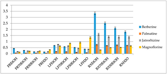 3.2. Quantitative Analysis of Alkaloids and Phenolics in the Extracts