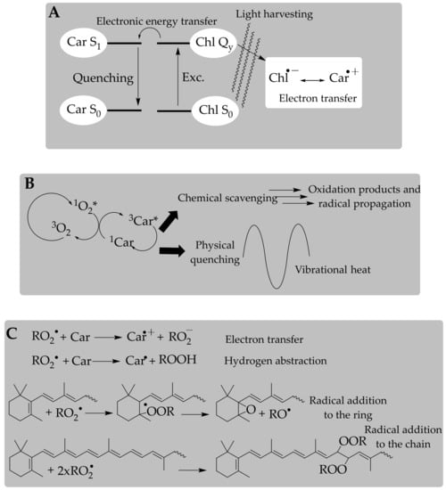 Mechanisms of the antioxidant action exerted by carotenoid pigments in different processes. The electron transfer from the characteristic conjugated polyenic chain of carotenoids to chlorophylls (A). Physical quenching of singlet oxygen (B). Electron transfer, hydrogen abstraction, and radical addition in the antioxidant activity against peroxyl radicals (C).