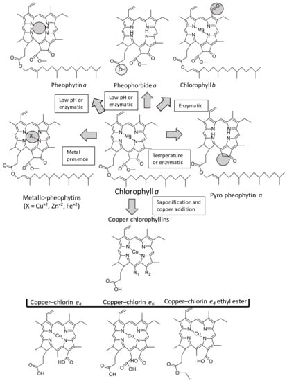 - Kang, Y.-R.; Park, J.; Jung, S.K.; Chang, Y.H. Synthesis, characterization, and functional properties of chlorophylls, pheophytins, and Zn-pheophytins. Food Chem. 2018, 245, 943–950. [Google Scholar] [CrossRef]