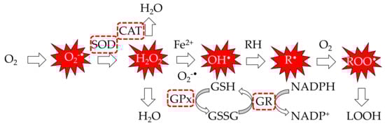 Reactions and enzymes involved in reactive oxygen species (ROS) generation and propagation analyzed in chlorophyll antioxidant studies: superoxide (O2·−), hydroxyl (OH·), peroxyl (RO2·), and hydrogen peroxide (H2O2). Antioxidant enzymes: SOD: superoxide dismutase, CAT: catalase, GPx: glutathione peroxidase, GR: glutathione reductase, GSH/GSSG: reduced/oxidized glutathione.