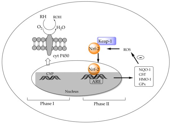 In addition to antioxidant enzymes, living cells develop programmed reactions to reduce the potential injury caused by xenobiotics through specific metabolism and later excretion. The group of enzymes involved is known as drug-metabolizing enzymes (DMEs), and their sequential function allows them to be categorized as Phase I, II, and III enzymes. Phase I enzymes oxidize drugs or xenobiotics, for example, cytochrome P450 monooxygenase (CYP), the expression of which is governed by several nuclear receptors. Phase II enzymes conjugate products of Phase I reactions, such as glutathione peroxidase (GPX), glutathione S-transferase (GST), heme oxygenase 1 (HMO-1), or NADPH quinine oxidoreductase 1 (NQO-1), among others (Figure 5). Nuclear factor erythroid 2 related factor 2 (Nrf-2) is the transcription factor considered to be the main inductor of the Phase II genes, commonly called antioxidant-response element (ARE) genes. In addition, Nrf-2 forms a complex in the cytoplasm with Keap-1 (Kelch-like epichlorohydrin-associated protein 1), which is a negative regulator of the Nrf-2/ARE pathway [199]. Phase III enzymes are responsible for the export of the final metabolites out of cells.