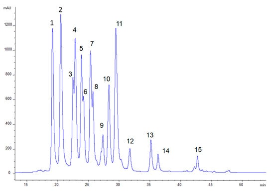 The anthocyanin-rich purified extract obtained as described in Section 2.4 was analysed by HPLC-DAD and ESI-MS. A representative chromatogram is shown in Figure 1.