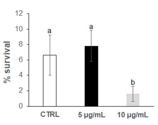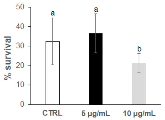 Percentages of worm survival at the 9th day of adulthood after the application of thermal stress (35 °C, 8 h). The results were obtained in the C. elegans wild-type N2 strain grown in the absence (controls) and presence of the bilberry anthocyanin extract at concentrations of 5 and 10 μg/mL in the culture medium. The results are presented as the mean values ± SD. Different letters between bars indicate significant differences, p < 0.05.