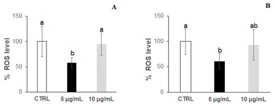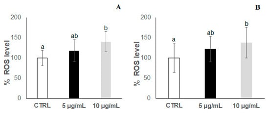 Reactive oxygen species (ROS) accumulation (expressed as percentage of fluorescence relative to controls) at the 2nd day of adulthood in C. elegans wild-type N2 strain grown in the absence (controls) and presence of the bilberry anthocyanin extract at concentrations of 5 and 10 μg/mL in the culture medium. Results obtained in (A) non-stressed worms and (B) worms subjected to thermal stress (35 °C, 2 h). In all cases, the assays were carried out in triplicate. The results are presented as the mean values ± SD. Different letters between bars indicate significant differences, p < 0.05.
