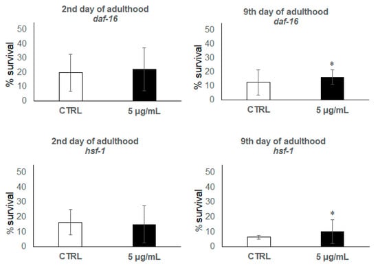 Percentages of worm survival at the 2nd and 9th day of adulthood after the application of thermal stress (35 °C, 8 h) in the C. elegans mutant strains daf-16 and hsf-1 grown in the absence (controls) and presence of 5 μg/mL of the bilberry anthocyanin extract. The results are presented as the mean values ± SD. The asterisk indicates a significant difference in relation to controls at p < 0.05.