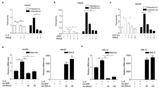 It is reported that IL-6 increases hepcidin expression through activation of the JAK2-STAT3 signaling pathway in response to inflammation [27]. To examine the effect of SMILE on IL-6-induced hepcidin expression in hepatocytes, we performed transient transfections with vectors expressing SMILE and hepcidin gene promoter in HepG2 cells, a human hepatoma cell line, and treated with IL-6. Interestingly, IL-6-induced promoter activity of human and mouse hepcidin gene was significantly decreased by SMILE (Figure 1a). In addition, SMILE inhibited hepcidin gene promoter activity by JAK2 and STAT3, respectively (Figure 1b,c). To further examine the inhibitory action of SMILE on IL-6-induced hepcidin gene transcription, we conducted adenoviral overexpression of GFP (Ad-GFP) or SMILE (Ad-SMILE) in HepG2 and AML12 cells, a non-transformed mouse liver cell line, treated with IL-6. Consistent with these results in transient transfection, overexpression of SMILE significantly suppressed induction of hepcidin mRNA expression by IL-6 stimulation in both cell lines (Figure 1d,e). Furthermore, we also found that SMILE inhibited IL-6-mediated hepcidin secretion in both human and mouse hepatoma cells (Figure 2a,d). Consequently, SMILE normalized decreased ferroportin expression by hepcidin (Figure 2b,c,e,f). These findings indicated that SMILE functions as a repressor of hepcidin transcriptional control by IL-6 signaling.