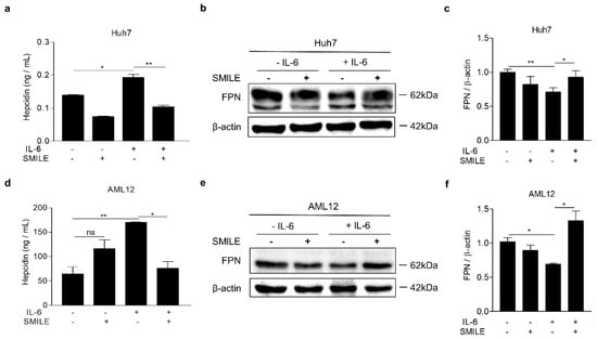 All blood samples were taken using an intra-cardiac puncture of mice under anesthesia before killing. Serum iron was measured using a spectrophotometric method (TBA-200FR NEO). Serum hepcidin was measured using a Mouse Hepc (Hepcidin) ELISA kit (Elabscience, TX, USA), according to the manufacturer’s protocols. For hepcidin measurement in cell culture media, Huh7 or AML12 cells were transfected with vector expressing SMILE and treated with IL-6 for 12 h after 2 h of serum starvation. Hepcidin levels were measured from the cell culture media using a Mouse Hepc (Hepcidin) ELISA kit (Elabscience) and a Human Hepcidin Quantikine ELISA kit (R&D Systems) according to the manufacturer’s protocols.
