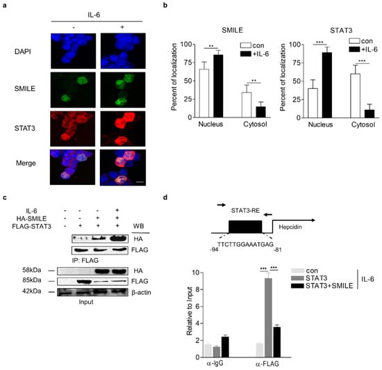 To identify the molecular mechanism by which SMILE suppresses IL-6-mediated hepcidin expression, we first investigated subcellular localization of SMILE and STAT3 in HepG2 cells treated with IL-6. While STAT3 was mainly localized in cytoplasm in the absence of IL-6, SMILE was localized in the nucleus. However, they co-localized in the nucleus in the presence of IL-6 (Figure 3a,b). In addition, co-immunoprecipitation analysis demonstrated that IL-6 strongly increased the interaction between SMILE and STAT3 (Figure 3c). Moreover, chromatin immunoprecipitation (ChIP) assay showed that STAT3 binds to a STAT3-responsive element (STAT3-RE) on the hepcidin promoter in the presence of IL-6, which was almost entirely abrogated by overexpression of SMILE (Figure 3d). These results suggest that SMILE disrupts IL-6-mediated hepcidin expression by inhibiting STAT3 binding to the hepcidin promoter.