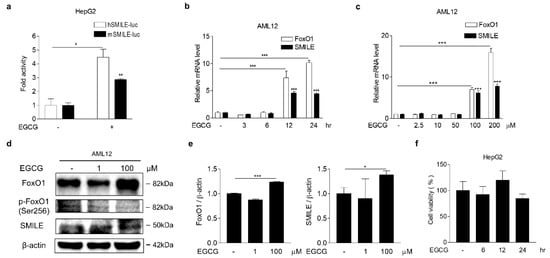 The transcriptional repressive activity of SMILE is modulated by natural polyphenolic compounds such as curcumin, a major active component of turmeric, and resveratrol, a polyphenol found in red wine [15,20]. However, the effect of EGCG, a major polyphenol in green tea, on SMILE expression has not yet been elucidated. To this end, we examined SMILE gene promoter activity and mRNA expression in hepatocytes treated with EGCG for 12 h. As anticipated, we found that both human and mouse SMILE gene promoter activity were significantly induced by EGCG treatment (Figure 4a). In addition, mRNA expression of SMILE and forkhead box protein O1 (FoxO1), a downstream transcription factor of EGCG [28], was continuously increased with time in EGCG-treated AML12 cells (Figure 4b). Moreover, FoxO1 and SMILE mRNA levels were induced at high doses of EGCG (>100 μM) (Figure 4c). Indeed, FoxO1 and SMLE protein levels were induced in AML12 cells treated with 100 μM of EGCG for 12 h, while p-FoxO1 levels were unaltered at this condition (Figure 4d,e). Finally, to examine a cytotoxic effect of EGCG, we treated HepG2 cells with 100 μM of EGCG in a time-dependent manner and found that EGCG had no cytotoxic effect on HepG2 cells with 24 h of treatment (Figure 4f).
