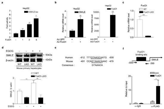 Next, we tested if FoxO1 regulates SMILE gene transcription using wild-type (WT) and liver-specific FoxO1 knockout (FoxO1-LKO) hepatocytes. Overexpression of FoxO1 significantly induced SMILE gene promoter activity and mRNA expression (Figure 5a,b). In addition, EGCG treatment increased SMILE protein levels in WT hepatocytes but not in FoxO1-LKO hepatocytes (Figure 5c,d). Moreover, close investigation of the SMILE gene promoter revealed that a putative FoxO1 binding sequence was conserved in human and mouse (Figure 5e). Consistent with this investigation, FoxO1 was significantly recruited to the FoxO1-binding region of the SMILE gene promoter, as investigated using ChIP assay (Figure 5f). These findings indicate that FoxO1 is a direct transcriptional regulator of SMILE gene in the presence of EGCG.
