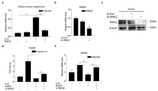 In order to investigate the role of SMILE in EGCG action on regulation of hepcidin expression, we first examined the effect of EGCG on IL-6-mediated hepcidin expression in mouse primary hepatocytes. As expected, IL-6 significantly increased hepcidin mRNA expression, which was almost entirely reduced by EGCG (Figure 6a). Next, to demonstrate the role of SMILE in inhibiting hepcidin expression by EGCG, we treated HepG2 cells with IL-6 and EGCG after transfection of vector-carrying hepcidin gene promoter and SMILE knockdown using small interfering RNAs for SMILE (si-SMILE). SMILE mRNA and protein levels were significantly decreased by si-SMILE (Figure 6b,c). Consequently, the inhibitory effect of EGCG on IL-6-induced hepcidin promoter activity was significantly blocked by SMILE knockdown (Figure 6d). In addition, we observed that SMILE knockdown considerably reversed the effect of the EGCG treatment on IL-6-mediated induction of hepcidin mRNA expression (Figure 6e). These results demonstrated that SMILE is required for EGCG action on the IL-6-dependent transcriptional regulation of hepcidin gene expression.