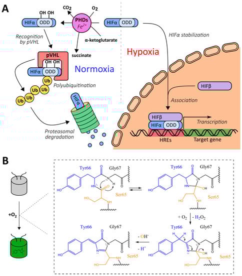 Some natural platforms for genetically encoded oxygen reporters’ development. (A) A simplified scheme of hypoxia-inducible factor (HIF) signaling system. (B) A simplified scheme of chromophore maturation in green fluorescent protein (GFP)-like fluorescent proteins (FPs).
