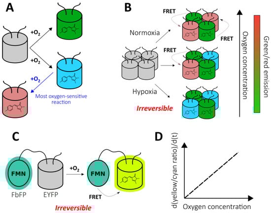 As stated previously, nlsTimer has internal control, making ratiometric readout possible, that is absent in most FPs which demonstrate intensiometric decrease in fluorescence intensity due to disrupted maturation when O2 supply is insufficient. One strategy to overcome this obstacle is to fuse a GFP-like FP with an FMN-based fluorescent protein (FbFP). Such proteins are derived from bacterial or plant light-oxygen-voltage-sensing domains that have been engineered to make the non-covalently bound FMN fluorescent []. In this regard, FbFPs do not require molecular oxygen for maturation, and they are characterized by having low molecular masses, which could be useful in some situations. Fluorescent protein-based biosensor for oxygen (FluBO) was developed by fusing enhanced yellow fluorescent protein (EYFP) (λex = 512 nm, λem = 530 nm) and FbFP (λex = 450 nm, λem = 495 nm) with a short amino acid linker, placing the chromophores at a favorable distance for FRET (Figure 2C) []. The fluorescence intensity ratio (530 nm/495 nm), which is excited at 380 nm, depends on the degree of EYFP maturation because it enhances the efficiency of energy transfer by increasing the acceptor concentration. The EYFP variant used in this work has a pKa of 5.2, and its emission is resistant to Cl− concentration changes up to 100 mM; therefore, the medium acidity and Cl− concentration are unlikely to affect FluBO readout []. The established fluorescence lifetime of mature FluBO in live Escherichia coli cells is 1.74 ns, compared to 2.73 ns of FbFP (according to biexponential and monoexponential analysis, respectively), indicating efficient FRET. If one imagines a portion of the FluBO protein that was synthetized under anoxic conditions, it might be expected that initially yellow fluorescence would be absent, and the fluorescence ratio would increase according to oxygen availability. Moreover, the molecules in which the EYFP chromophore had already been formed would create a strong background of efficient FRET. Therefore, although the FluBO ratio reflects the oxygen concentration at any given moment (which was proven by E. coli batch cultivation) the best way to read FluBO signal is to measure the rate of the ratio increase (dR/dt). The authors demonstrated that the rate of the ratio increase could even be calibrated to obtain absolute oxygen concentration values (Figure 2D) []. Productive FluBO performance in living systems—beyond imaging shifts from anoxic to normoxic conditions—apparently requires fast metabolism in order to produce new reporter molecules at a reasonable rate. It might be productive to complement the probe with a degron to increase biosensor turnover in order to reduce the background signal created by molecules that have already matured. Recently, the probe was adapted for fungal expression systems, namely Saccharomyces cerevisiae and Candida albicans [].