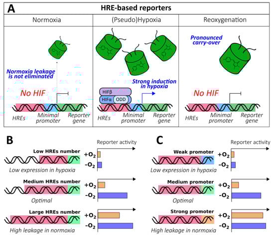 The expression and induction rates could be further adjusted by selecting an appropriate promoter (Figure 3C). In an early study by Shibata et al., the addition of the minimal E1b fragment containing a typical TATA box to 5xHRE-(385 bp VEGFP sequence)-luciferase resulted in a 2-fold induction increase []. It was later shown that the substitution of (385 bp VEGFP sequence)-E1b for hCMVmp stimulated normoxic leakage; however, it increased the hypoxic induction rate 5-fold []. Boast el al. revealed that the combination of PGK-derived HREs with the SV40mp resulted in higher expression in hypoxic conditions at the cost of a more pronounced normoxic leakage compared to MLVmp []. In several studies, it was demonstrated that when very strong promoters were combined with HREs, they failed to respond to hypoxia. Thus, after preliminary tests, Cai et al. selected the SV40 minimal promoter, rather than CMV, to develop a therapeutic vector for delivering a matrix metalloproteinase-9/GFP fusion to the ischemic brain []. The EF-1α promoter, one of the strongest mammalian promoters, in combination with 5 VEGF-derived HREs was not as capable of inducing luciferase expression in hypoxia []. Certain issues could arise with tissue-specific delivery of the reporters. In a study by Phillips et al., the HRE-MLC-2v element provided selective luciferase expression in heart tissue; however, hypoxia-mediated induction was observed only when HIF-1α was overexpressed in parallel, suggesting that HIF had decreased access to such sequence []. In any case, performance of each HREs/promoter combination should be experimentally studied in the system of interest before implementation in physiological models.