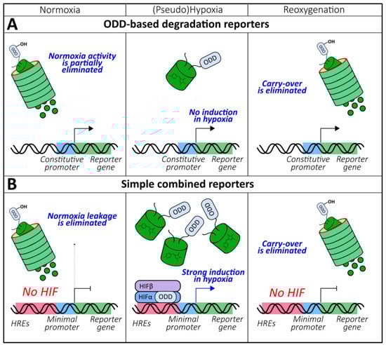 The general behavior of (A) oxygen-dependent degradation domain (ODD)-based degradation and (B) simple combined genetically encoded oxygen reporters in normoxia, (pseudo)hypoxia and reoxygenation.