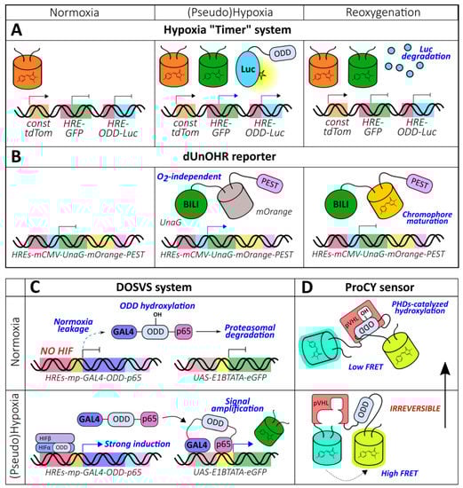 More complex genetically encoded oxygen reporters. (A) Hypoxia “Timer” system and (B) dUnOHR reporter that allow for distinguishing normoxic, hypoxic and reoxygenated cells on the basis of the observed optical reporters combination. (C) Dual oxygen-sensing hypoxia responsive sensor/effector viral expression system (DOSVS) that provides high induction rate due to eliminated normoxia leakage and signal amplification during hypoxia. (D) ProCY is an ODD hydroxylation-based reporter constructed according to a classic genetically encoded Förster resonance energy transfer (FRET)-biosensor design.