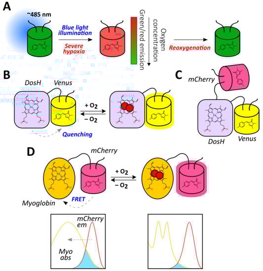 Finally, in several studies, genetically encoded oxygen sensors based on haem-containing proteins were developed in which oxygen binding altered their ability to quench reporter module fluorescence or to act as a dark energy acceptor. In the next sections, we describe all of these tools from a mechanistic point of view and discuss their advantages and possible limitations.