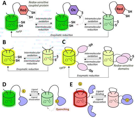 The main architectural types of genetically encoded fluorescent indicators (GEFIs) of metabolic and redox parameters based on a single optical reporter. Redox-sensitive fluorescent proteins (roFPs) with (A) or without (B) additional sensory domain. (C) Indicators based on a circularly permuted fluorescent protein (cpFP) with a sensory domain that can be modified by analyte. (D) Indicators based on the direct effect of a sensory domain-bound analyte on the chromophore of the FP. (E) Indicators based on the ligand binding by a sensory domain which transmits conformational changes to the chromophore microenvironment altering its optical properties.