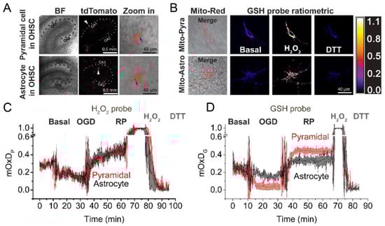 The roGFP signal primarily depends on the redox state of the glutathione pool because the concentration of glutathione in the cell is very high. Nevertheless, several more specific sensors for glutathione have been developed involving a redox-sensitive FP that is fused to glutaredoxin, the enzyme that catalyzes the equilibration between GSH and GSSG (Figure 7A). Glutaredoxin fusion causes the indicator to show higher specificity to glutathione redox state and give a more rapid response. With this technique, Grx1-roGFP2 was constructed. This probe showed an approximately 100,000-fold faster response to GSSG compared to the original roGFP2 []. For more detailed information about roGFPs, see reviews [,]. The red-shifted redox FP, specific to glutathione, is also available today []. Grx1-roCherry had a design similar to Grx1-roGFP2: human Grx1 was fused to the redox-sensitive variant of red FP mCherry. Grx1-roCherry is more susceptible to oxidation than Grx1-roGFP2 due to an increased negative redox potential. This indicator was used in a hypoxia-reoxygenation model in parallel with Grx1-roGFP2-mito; it was shown that the cytosolic glutathione pool was much more stable compared to the mitochondrial pool when oxygen levels were changing.