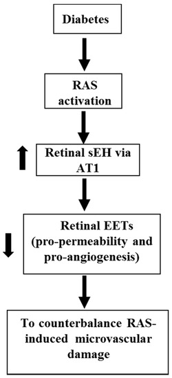 A robust body of literature has established the role of RAS in DR [108,109,110,111,112,113,114,115]. In RAS, prorenin is activated to form renin [108,109,110,111,112], which converts angiotensinogen to Angiotensin I (Ang I) [108,109,116]. Ang I is then hydrolyzed by angiotensin-converting enzyme (ACE) to produce Angiotensin II (Ang II) [108,109]. Ang II is the major bioactive product of RAS, and Ang II receptor type 1 (AT1 receptor) is the primary receptor to mediate the function of Ang II [117,118,119,120]. Several clinical studies are designed to determine the effects of RAS blockade in the development of DR because RAS activation is implicated in DR development in animal studies [108,109,110,111,112]. EUCLID trial demonstrates that ACE blockade by lisinopril attenuated the progress of DR to proliferative DR [121]. The DIRECT trial was divided into the DIRECT-Prevent group (n > 1400) and the DIRECT-Protect group (n > 1900) [108,122]. While AT1 blockade by candesartan decreased the incidence of DR, AT1 blockade did not attenuate the progression of established DR [122]. Thus, a lack of understanding of the molecular mechanism of retinal microvascular damage induced by RAS is a critical barrier to the use of RAS blockade to prevent or treat DR. To address the disappointing results of the DIRECT trial, our recent study [64] shows that Ang II increases retinal sEH expression, which is blunted by an AT1 blocker; 11,12-EET exacerbates Ang II-retinal vascular leakage; diabetes (STZ model) induces retinal angiotensinogen and AT1 expression (RAS activation), which is associated with increased retinal sEH expression; and sEH KO (increasing EETs) exacerbates diabetes-induced retinal vascular leakage. Based on these results, we propose a hypothesis that during diabetes, RAS activation augments retinal sEH, via AT1, which decreases EETs (pro-permeability and pro-angiogenesis factors) to counterbalance the effects of RAS on retinal microvascular damage (Figure 5).