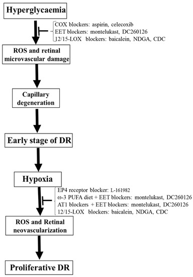 In conclusion, although anti-VEGF and photocoagulation therapy have improved care in DR patients, these therapies still cause significant side effects. Thus, there is a critical need to identify new therapeutic targets to treat or prevent DR progression. COX-derived, LOX-derived, and CYP-derived eicosanoids regulate oxidative stress, retinal VEGF levels, and inflammatory cytokines, as well as being involved in the pathophysiology of DR. There are many available approaches, including selective blockers, transgenic mice, and knockout mice, to permit researchers to study the functions of these lipid mediators in the retina as well as their role in the pathophysiology of DR. These lipid mediators are essential therapeutic targets for DR because many receptors and these three eicosanoid pathways are well defined. Thus, we propose that COX blockers (aspirin and celecoxib), EET blockers (montelukast (a selective CYP2C inhibitor [129,130]) and DC260126 (an EET receptor antagonist [131,132])), and 12/15-LOX blockers (baicalein, NDGA, and CDC) could be the potential therapeutic methods to prevent the development of early-stage DR (Figure 6). We also propose that EP4 receptor blocker (L-161982), ω-3 PUFA diet + EET blockers (montelukast and DC260126), AT1 blockers + EET blockers (montelukast and DC260126), and 12/15-LOX blockers (baicalein, NDGA, and CDC) could be the potential therapeutic methods to prevent the development of proliferative DR (Figure 6). Finally, since oxidative stress represents a vital regulator of eicosanoids-mediated microvascular dysfunction in DR and other diseases, antioxidants could be a therapeutic approach to interrupt eicosanoid signaling and in turn improving visual outcome in DR.