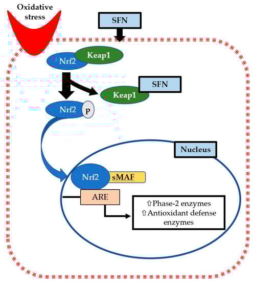 Sulforaphane (SFN) reduces oxidative stress via phosphorylation and accumulation of nuclear factor E2 factor-related factor (Nrf2) inside the nucleus. Therefore, it binds with the small musculoaponeurotic fibrosarcoma (sMAF) protein to activate specific antioxidant responsive element (ARE) present in gene promoter. Then, it elicits transcription of various phase 2 detoxification enzymes and antioxidant defense enzymes such as glutathione S-transferase (GST), heme oxygenase 1 (HO-1), NADPH quinone oxidoreductase (NQO), and thioredoxin reductase (TR) to reduce oxidative stress.