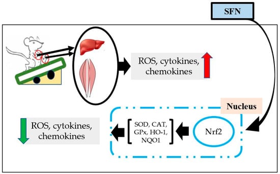 Exercise is a purposeful activity to maintain both physical and mental health. Routine exercise boosts our immune system, improves general health, and protects against different metabolic and chronic diseases []. Moreover, the activities of proteolytic enzymes significantly increases due to the adaptive response of moderate routine exercise []. Whilst regular physical exercise has many health benefits, these beneficial effects can be reversed with intense/exhaustive exercise. As such, depending on the intensity and duration of exercise, it may cause muscle and/or organ damage []. During acute and/or exhaustive exercise, inflammatory cells such as neutrophils and macrophages infiltrate into injured tissues and can, therefore, reduce exercise performance and increase fatigue and soreness. Exercise enhances free radical production and oxygen supply via the mitochondrial electron transport chain (ETC), which is a prime source of ROS production. Exercise increases blood supply in muscle tissue, but excessive production of ROS causes hypoperfusion of other internal organs, and results in organ damage. Production of cytokines, chemokines, and damage-associated molecular patterns (DAMPs) are increased in the damaged cells, which enhances migration of leukocytes to the damaged tissues and causes further damage []. In this regard, SFN is an active antioxidant to prevent muscle and internal organ damage (Figure 2). Although NF-κB is activated in response to inflammatory responses, modulation of Nrf2 is also considered as an important step in reducing inflammation [].