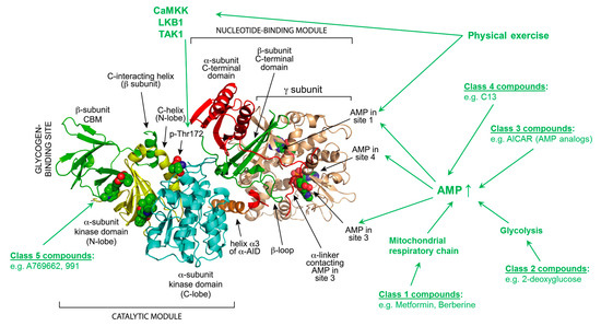 Structure and regulation of heterotrimeric AMPK. The model was created with MacPyMol using protein database (PDB) file 4CFE. The α, β and γ subunits are shown in “cartoon view” with domains color-coded. The three bound molecules of AMP, and phospho-Thr172 are shown in “sphere view” with C atoms green, O red, N blue and P orange. The different classes of compounds and their specific points of action are listed in green. Abbreviations: AICAR: 5-aminoimidazole-4-carboxymide ribonucleoside; AID: autoinhibitory domain; AMP: adenosine monophosphate; AMPK: adenosine monophosphate protein kinase; CaMKK: calmodulin-dependent kinase kinases; CBM: carbohydrate-binding module; C13: compound 13; LKB1: liver kinase B1; TAK1: transforming growth factor-β-activated kinase 1; Thr: threonin; adopted from [59] with permission. Copyright © 2014 Elsevier Inc. All rights reserved.