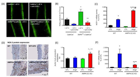 Our group showed that angiotensin II infusion (1 mg/kg/d) resulted in significant endothelial dysfunction which was characterized by a dramatic increase in the superoxide signal in the vascular wall as well as an increased myocardial NADPH oxidase activity [35]. The activation of AMPK in this model using daily AICAR injections (200 mg/kg/d) led to a significant improvement of the endothelial dysfunction, diminished superoxide production in the vascular wall and a reduction in myocardial NADPH oxidase activation [35]. Based on these data, we demonstrated that AMPK, especially the isoform α1AMPK, is a protective enzyme in the vascular system. Further evidence showed that AICAR injections were ineffective in AT II-infused α1AMPK or PGC-1α global knockout animals [35]. Furthermore, we were able to show that AT II (low dose 0.1 mg/kg/d) infusion in α1AMPK knockout animals resulted in a more pronounced endothelial dysfunction, oxidative stress and inflammatory response compared with the corresponding wild-type animals. These changes correlated with increased expression of the NADPH oxidase subunit NOX-2 (mRNA and protein), which represents the essential catalytic subunit of the phagocytic NADPH oxidase. Suppression of the NADPH oxidase by in vivo administration of apocynin decreased vascular ROS production and also preserved the vascular inflammatory response as assessed by inducible NO synthase (iNOS), cyclooxygenase-2 (COX-2) and vascular cell adhesion molecule 1 (VCAM-1). However, an important limitation of this study was in the use of global knockout animals, as α1AMPK deletion has effects in a variety of tissues that are not isolated only to vascular tissue. Further, Föller et al. were able to show that α1AMPK plays a decisive role in erythrocyte survival through their demonstration that erythrocytes of α1AMPK global knockout animals have a much shorter lifespan, which leads to a severe splenomegaly [93]. Therefore, a new study was designed using endothelial-specific knockout animals, which lack α1AMPK exclusively in endothelial cells, presenting novel mechanistic insights on the protection of the vasculature against oxidative damage in vivo [94]. Loss of endothelial α1AMPK impairs the endothelial cell barrier function, resulting in an enhanced recruitment of inflammatory cells to the vascular wall (Figure 3A,B). Based on these changes, cytokines and vascular adhesion molecules, as well as inflammatory proteins were upregulated. In this endothelial-specific α1AMPK mouse model, we found that the counterpart of the chemokine C-C chemokine receptor type 2 (CCR2), the ligand monocyte chemoattractant protein-1 (MCP-1) (Figure 3C), significantly increased in the aorta of these mice, which resulted in higher α1AMPK-mediated immune cell infiltration and increased NOX-2 protein expression (Figure 3D). This was accompanied by augmented production of vascular reactive oxygen species (Figure 3E). In addition to the inflammatory response, AT II-induced cytoprotective HO-1 upregulation was suppressed in α1AMPK-deficient cells [94]. In summary, endothelial-specific α1AMPK seems to be a crucial element in the recruitment of inflammatory cells to the vasculature, modulating inflammatory responses and vascular function in a pro-oxidative milieu [94].