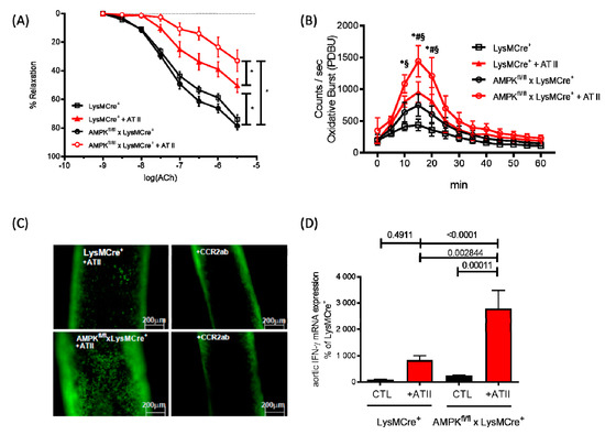 A milestone in the field of immune cell-specific AMPK research was the manuscript by Mounier et al. published in 2013 [102]. They described for the first time the consequences of α1AMPK depletion in myeloid cells in the setting of muscle injury in mice. Macrophages lacking the α1AMPK subunit were dysfunctional, in that they maintained M1 polarization [102]. The number of anti-inflammatory M2 macrophages were decreased, resulting in an impairment of both the release of anti-inflammatory cytokines and phagocytosis of necrotic and apoptotic cells. In this context, we investigated the role of α1AMPK in a model of AT II-induced endothelial dysfunction using a myeloid cell-specific α1AMPK knockout mouse. These animals are characterized by a permanent, non-inducible α1AMPK deletion in myeloid cells and display a pro-inflammatory vascular phenotype in response to specific stimuli (e.g., angiotensin II) [103]. Severe endothelial dysfunction (Figure 4A) and oxidative stress (Figure 4B) with a pronounced F4/80+ macrophage and GR1+ granulocyte infiltration in the vasculature were present in these mice, compared with wild-type control animals. Since CCR2 plays a pivotal role in AT II-induced vascular inflammation (Figure 4C), the increased CCR2 expression on α1AMPK-depleted macrophages caused vascular inflammation with a high secretion of IFN-γ, IL-6 and TNF-α (Figure 4D) [103]. In addition to these reports on disease models, other studies highlighted the physiological role of AMPK in the regulation of immune cells, since the modulation of AMPK activity results in an abolished inflammatory response [104,105,106] and demonstrated a significant reduction in IFN-γ and TNF-α release after AMPK activation with metformin, berberine and AICAR.