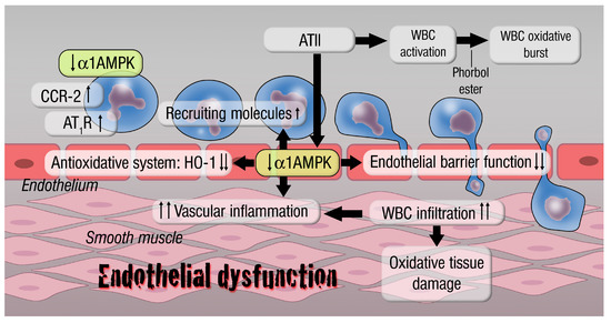 Inflammatory responses on myelomonocytic- and endothelial-specific α1AMPK knockout cells. Loss of myelomonocytic (LysMCre)-specific α1AMPK affects vascular and whole blood oxidative stress and endothelial function by regulating the recruitment of inflammatory cells (enhancement of CCR-2, MCP-1 and other recruiting molecules) to the vascular wall and higher white blood cell (WBC) activation state (reflected by WBC oxidative burst). This also promotes an increase in angiotensin II receptor type 1, leading to higher responsiveness towards pro-oxidant stimuli and in conclusion a pro-inflammatory phenotype (IL-6, TNFα, IFNγ upregulation). Loss of endothelial-specific α1AMPK impairs the endothelial barrier function, resulting in an increased CCR-2/MCP-1 (recruiting molecules)-mediated infiltration of inflammatory cells. This situation provokes an overproduction of reactive oxygen species, leading to oxidative tissue damage and vascular inflammation. Furthermore, deletion of endothelial-specific α1AMPK disables the antioxidant system by blunting HO-1 induction. Abbreviations: AMPK: adenosine monophosphate-activated protein kinase; AT II: angiotensin II; AT1R: angiotensin II receptor type 1; CCR-2: C-C motif chemokine receptor 2; HO-1: heme oxygenase-1; WBC: white blood cell.